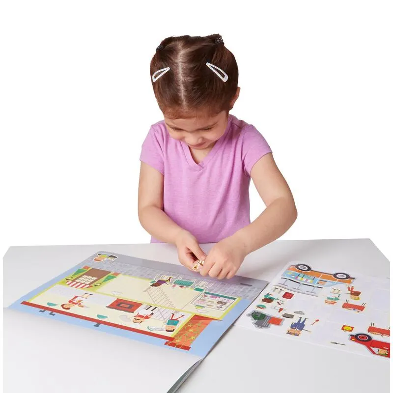 Αυτό το σετ επαναχρησιμοποιούμενων αυτοκόλλητων μετατρέπει κάθε παιχνίδι σε νέα περιπέτεια. Με πάνω από 200 αυτοκόλλητα και πέντε μεγάλες σκηνές πόλης, μπορώ να φτιάξω δικές μου ιστορίες με πυροσβέστες, οικοδόμους, πωλητές και φίλους στο πάρκο. Τα αυτοκόλλητα ξεκολλούν, μετακινούνται και κολλούν ξανά εύκολα—ατελείωτη διασκέδαση και δημιουργικότητα!
